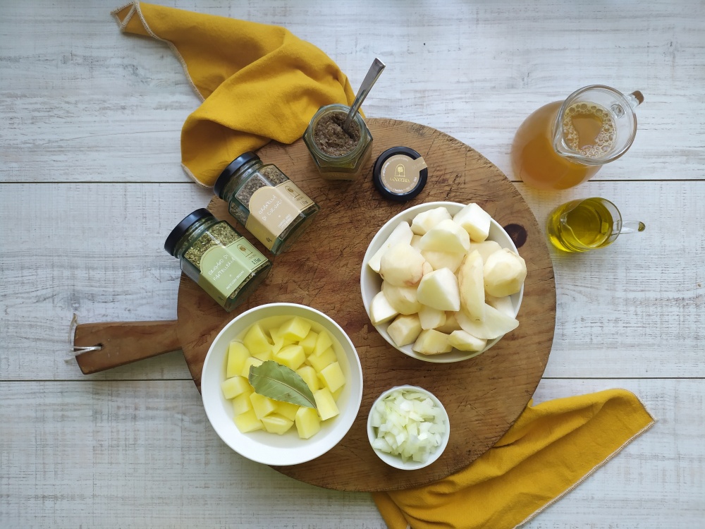 Chop the onion, peel the potato, cut it into cubes and keep it in water, then peel the Jerusalem artichokes and cut them into chunks. In a saucepan, sauté the onion with a drizzle of oil over low heat, add 40 g of caper and olive paté, the bay leaf and the potato, brown well for a few minutes, then add the Jerusalem artichokes and cover flush with the broth vegetable, then continue cooking at a light boil until the vegetables are soft.