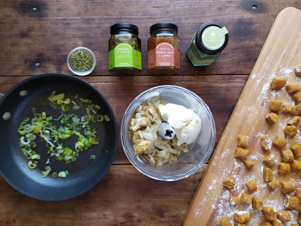 Nel frattempo preparare i gnocchetti, riunire in una ciotola la farina con il pane grattugiato, il paté di pomodori secchi e capperi, le uova, l’olio, una presa di origano ed amalgamare bene il tutto con un cucchiaio o meglio ancora con le mani, infine versare tanta acqua quanta serve per ottenere un impasto ben amalgamato, umido, ma non appiccicaticcio.